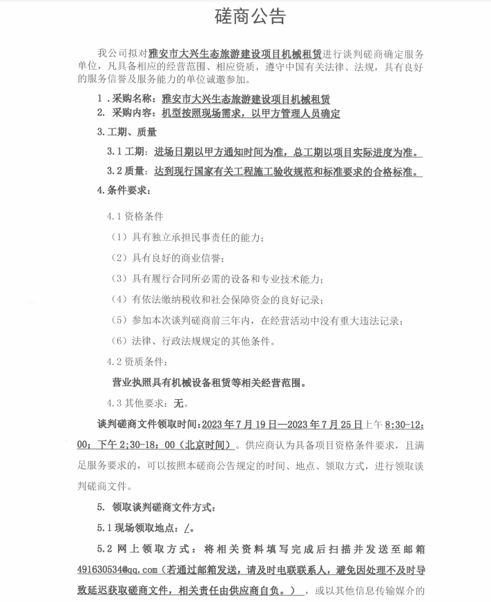 雅安市大興生態(tài)旅游建設(shè)項目機(jī)械租賃談判磋商公告