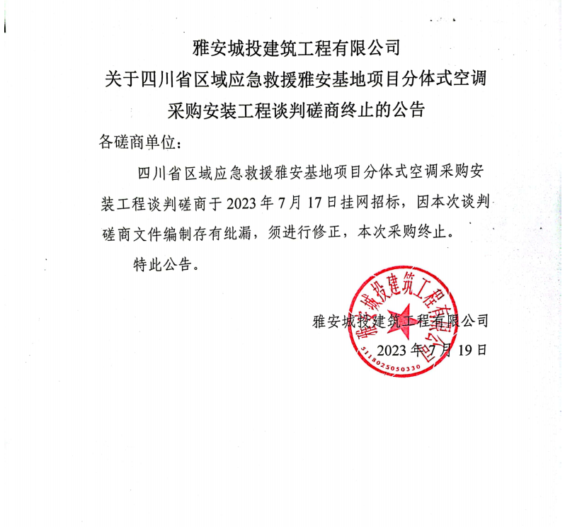 雅安城投建筑工程有限公司關于四川省區(qū)域應急救援雅安基地項目分體式空調采購安裝工程談判磋商終止的公告