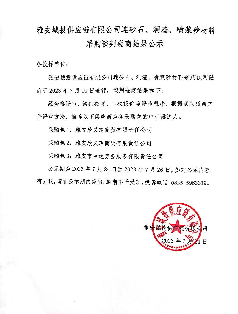 雅安城投供應鏈有限公司連砂石、洞渣、噴漿砂材料采購談判磋商結(jié)果公示