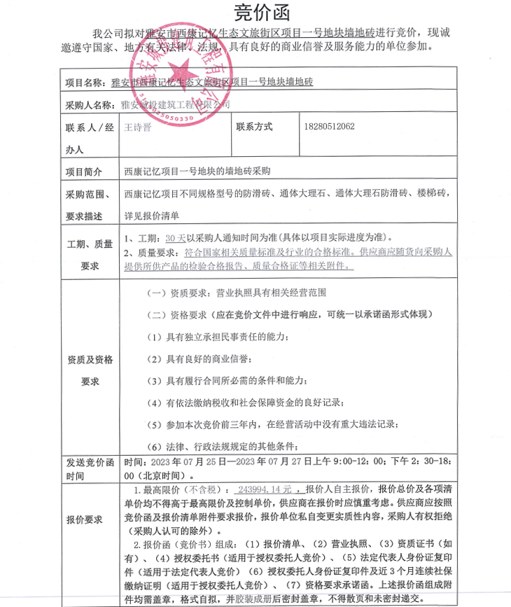 雅安市雅安市西康記憶生態(tài)文旅街區(qū)項(xiàng)目一號(hào)地塊墻地磚競(jìng)價(jià)采購(gòu)公告