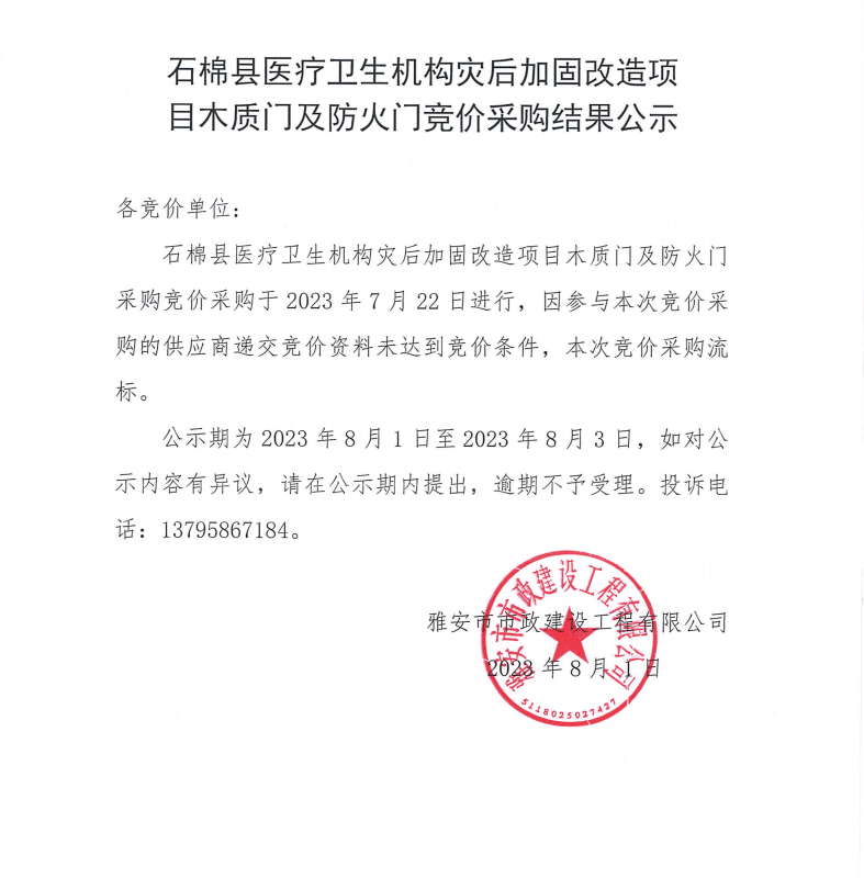 石棉縣醫(yī)療衛(wèi)生機(jī)構(gòu)災(zāi)后加固改造項(xiàng)目木質(zhì)門及防火門競(jìng)價(jià)采購(gòu)結(jié)果公示