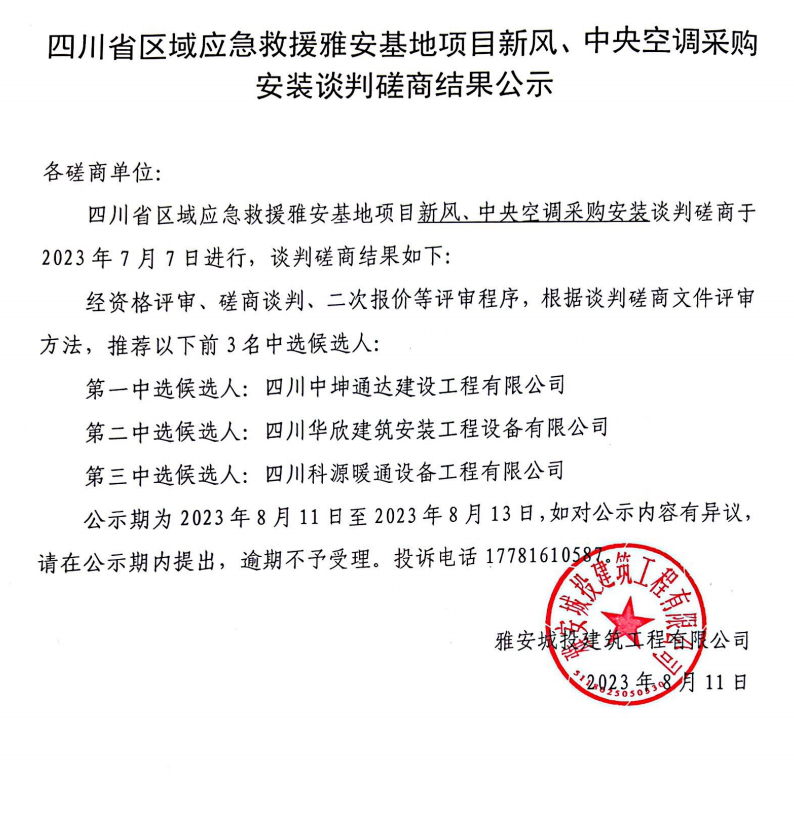 四川省區(qū)域應急救援雅安基地項目新風、中央空調采購安裝談判磋商結果公示