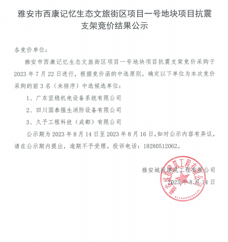 雅安市西康記憶生態(tài)文旅街區(qū)項(xiàng)目一號(hào)地塊項(xiàng)目抗震支架競(jìng)價(jià)結(jié)果公示