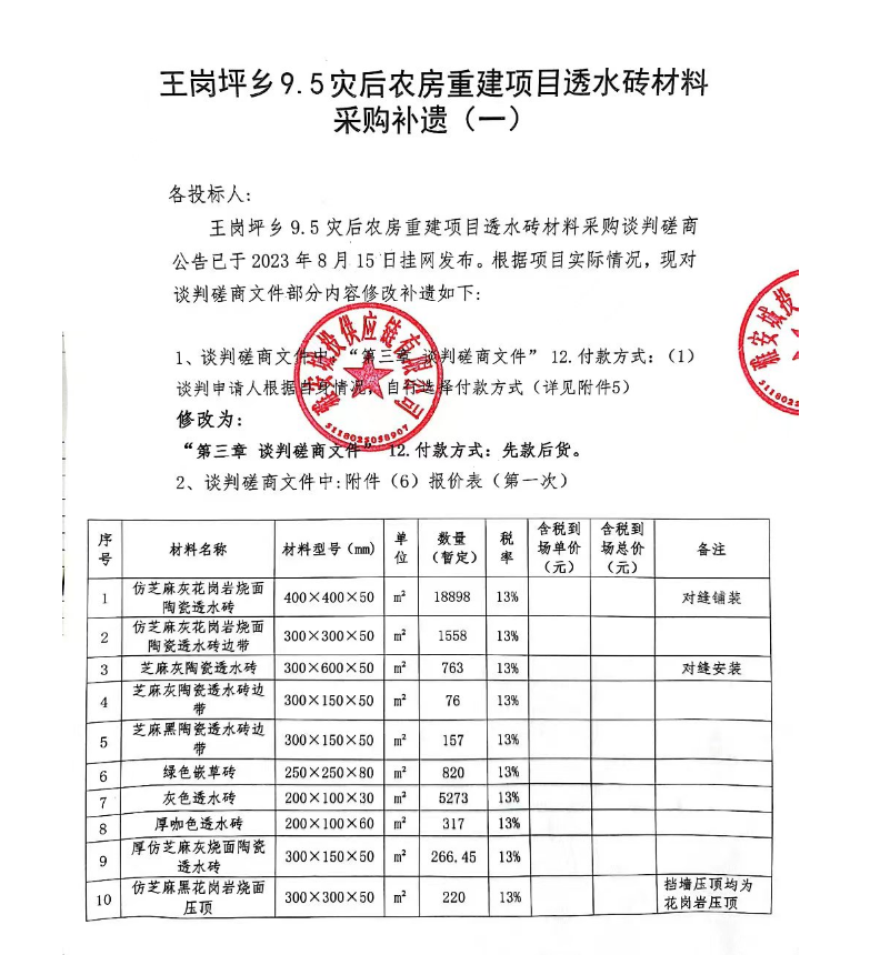 王崗坪鄉(xiāng)9.5災后農(nóng)房重建項目透水磚材料采購補遺(一)