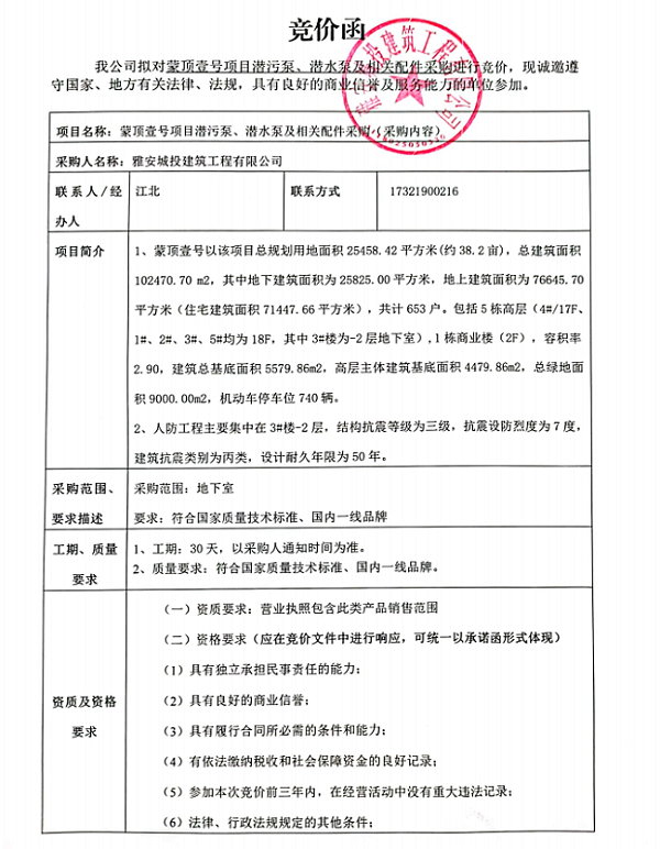 蒙頂壹號項(xiàng)目潛污泵、潛水泵及相關(guān)配件采購競價(jià)公告
