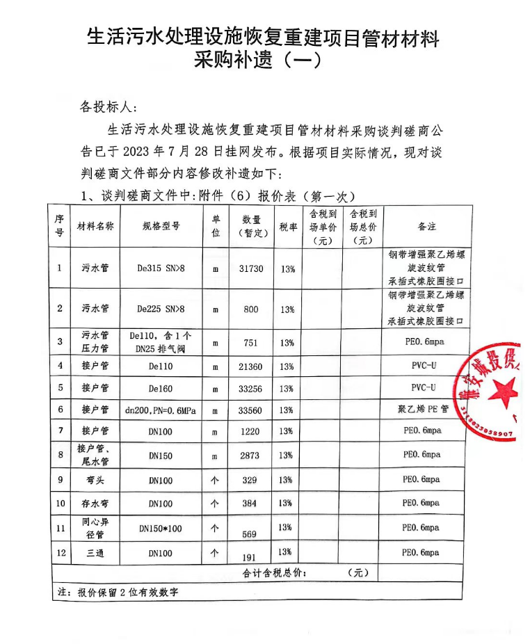 生活污水處理設(shè)施恢復(fù)重建項目管材材料采購補(bǔ)遺(一)