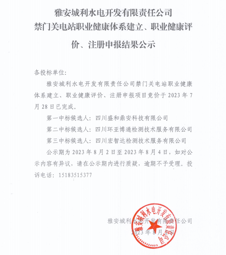 雅安城利水電開(kāi)發(fā)有限責(zé)任公司禁門關(guān)電站職業(yè)健康體系建立、職業(yè)健康評(píng)價(jià)、注冊(cè)申報(bào)結(jié)果公示