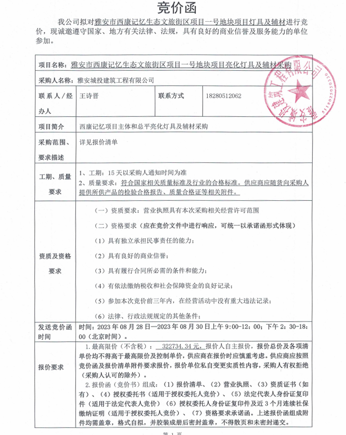 雅安市西康記憶生態(tài)文旅街區(qū)項目一號地塊項目燈具及輔材競價采購公告
