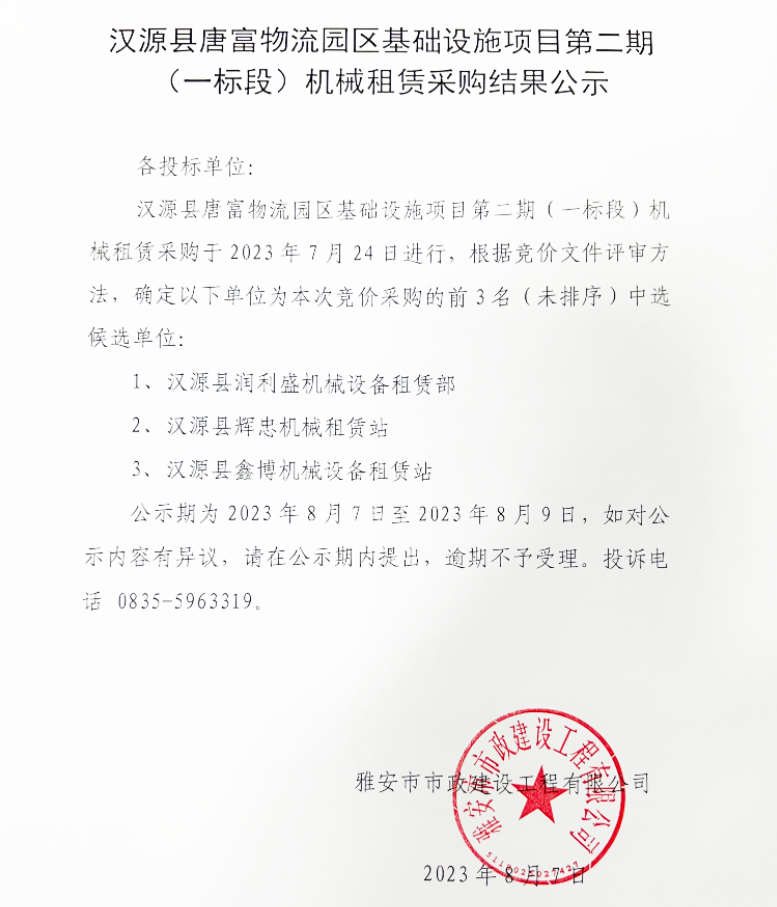 漢源縣唐富物流園區(qū)基礎(chǔ)設(shè)施項目第二期(一標(biāo)段)機(jī)械租賃采購結(jié)果公示