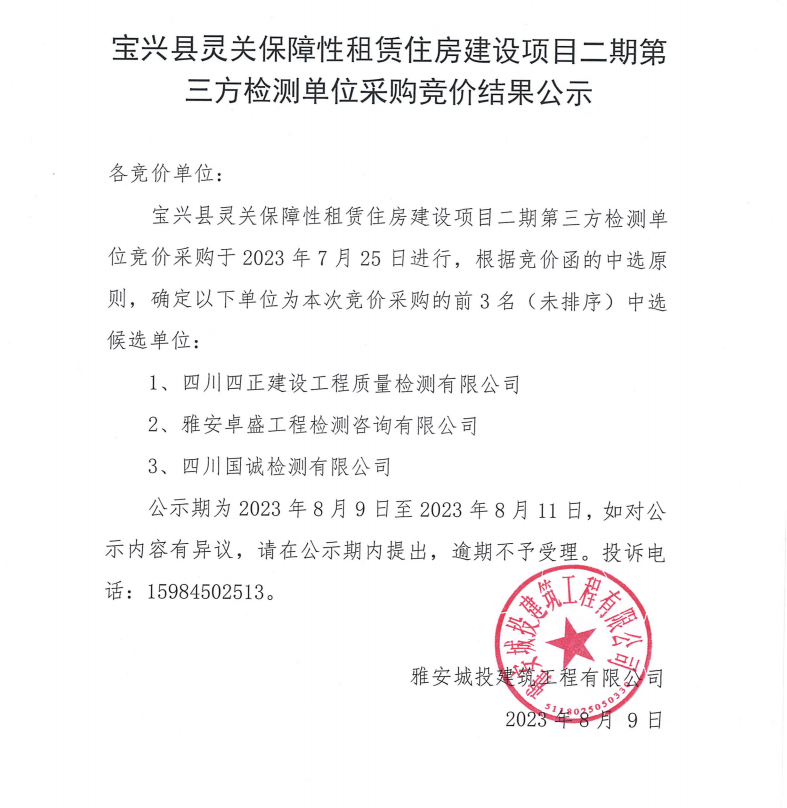 寶興縣靈關(guān)保障性租賃住房建設(shè)項(xiàng)目二期第三方檢測(cè)單位采購競(jìng)價(jià)結(jié)果公示