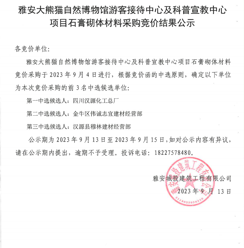 雅安大熊貓自然博物館游客接待中心及科普宣教中心項目石膏砌體材料采購競價結果公示