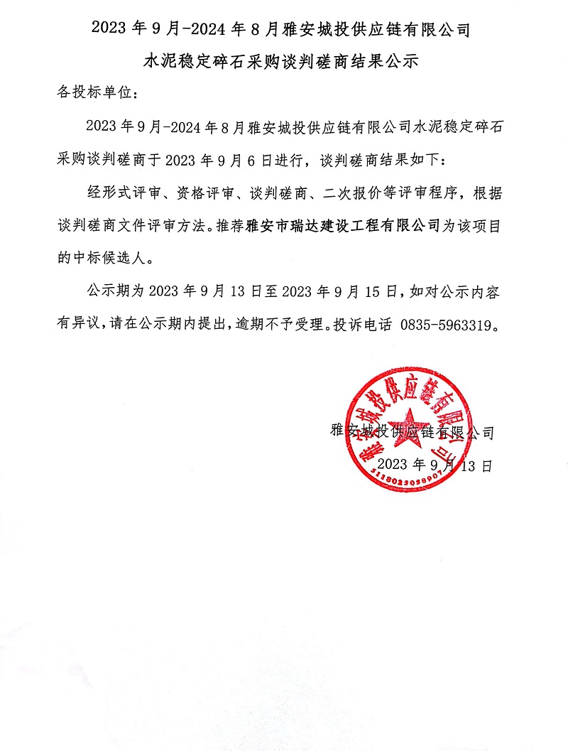 2023年9月-2024年8月雅安城投供應(yīng)鏈有限公司水泥穩(wěn)定碎石采購(gòu)談判磋商結(jié)果公示