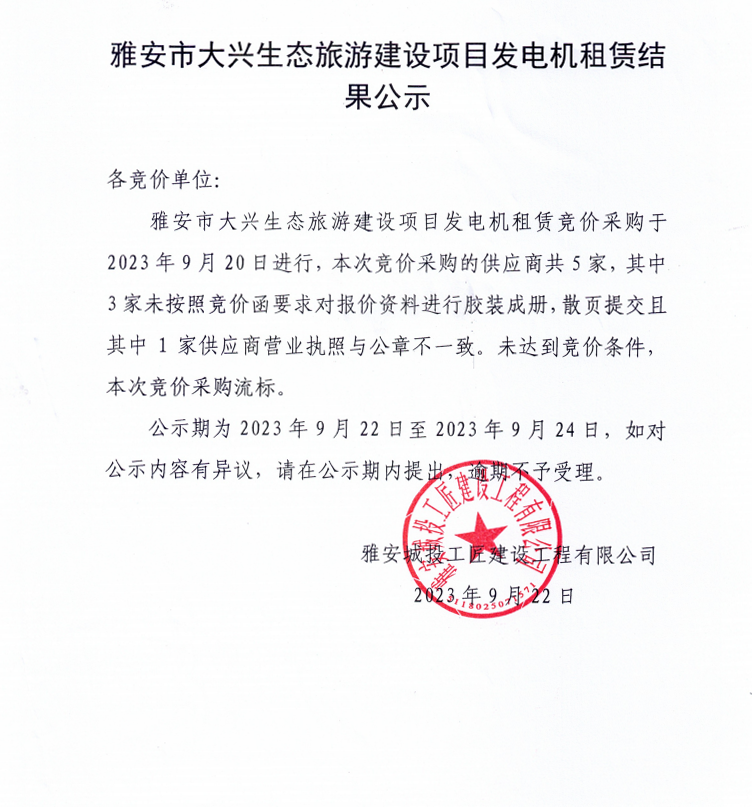 雅安市大興生態(tài)旅游建設(shè)項目發(fā)電機租賃結(jié)果公示