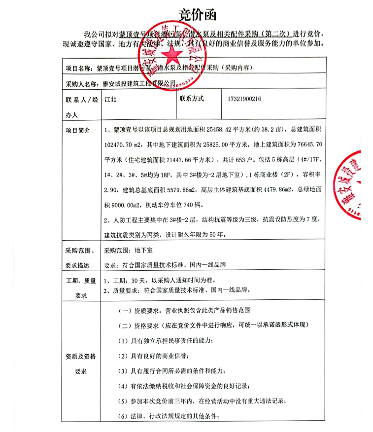 蒙頂壹號項目潛污泵、潛水泵及相關(guān)配件采購(第二次)競價公告