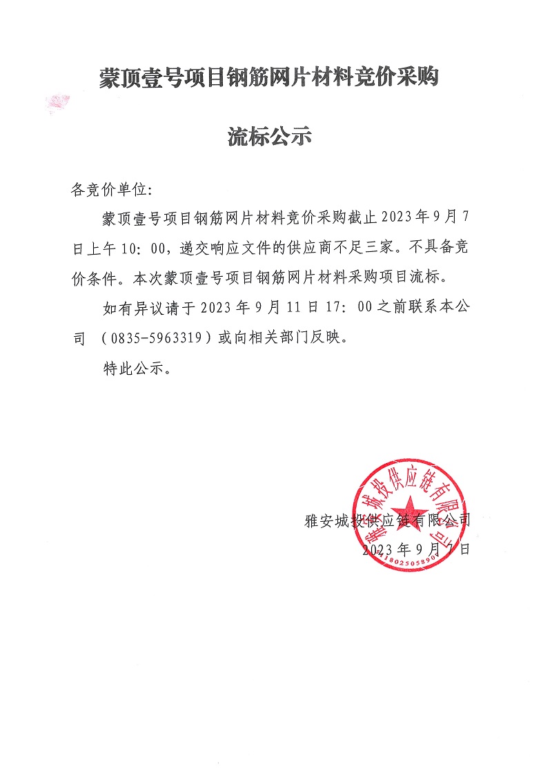 蒙頂壹號(hào)項(xiàng)目鋼筋網(wǎng)片材料競(jìng)價(jià)采購(gòu)流標(biāo)公示