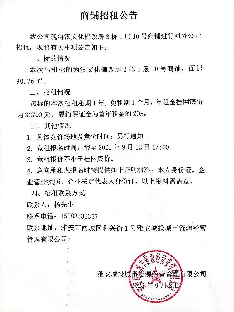 漢文化棚改房3棟1層10號商鋪招租公告