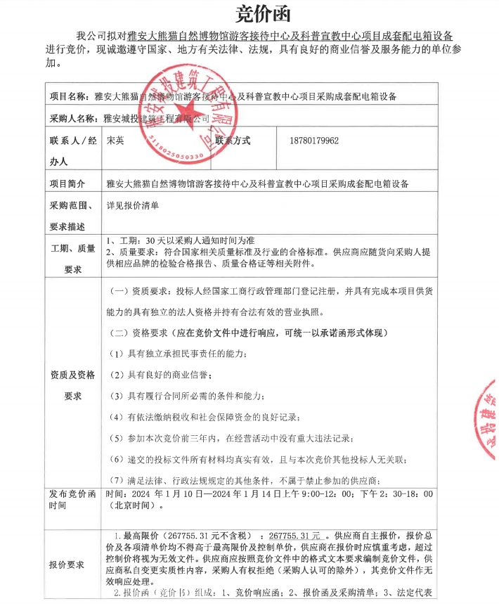 雅安大熊貓自然博物館游客接待中心及科普宣教中心項(xiàng)目成套配電箱設(shè)備競(jìng)價(jià)公告
