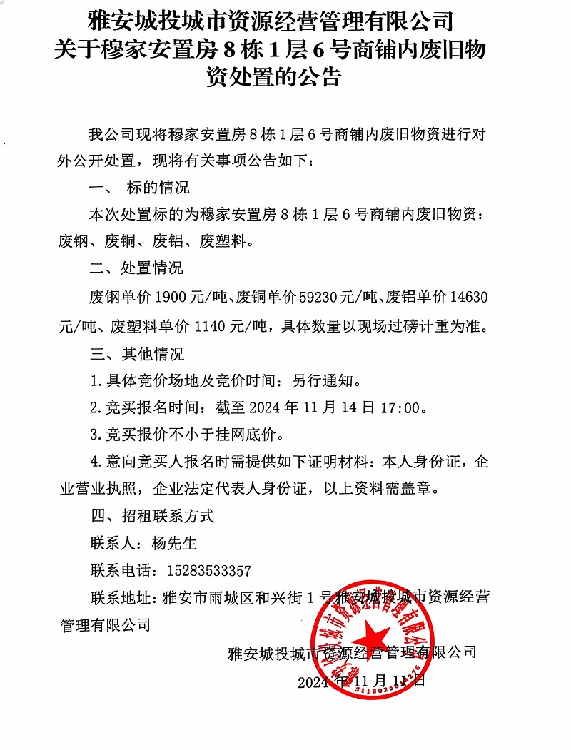 雅安城投城市資源經(jīng)營管理有限公司關(guān)于穆家安置房8棟1層6號商鋪內(nèi)廢舊物資處置的公告公告