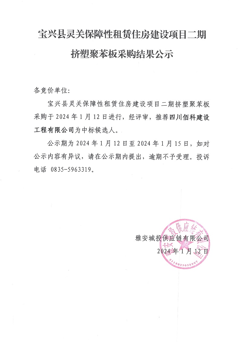 寶興縣靈關(guān)保障性租賃住房建設(shè)項(xiàng)目二期技塑聚苯板采購結(jié)果公示