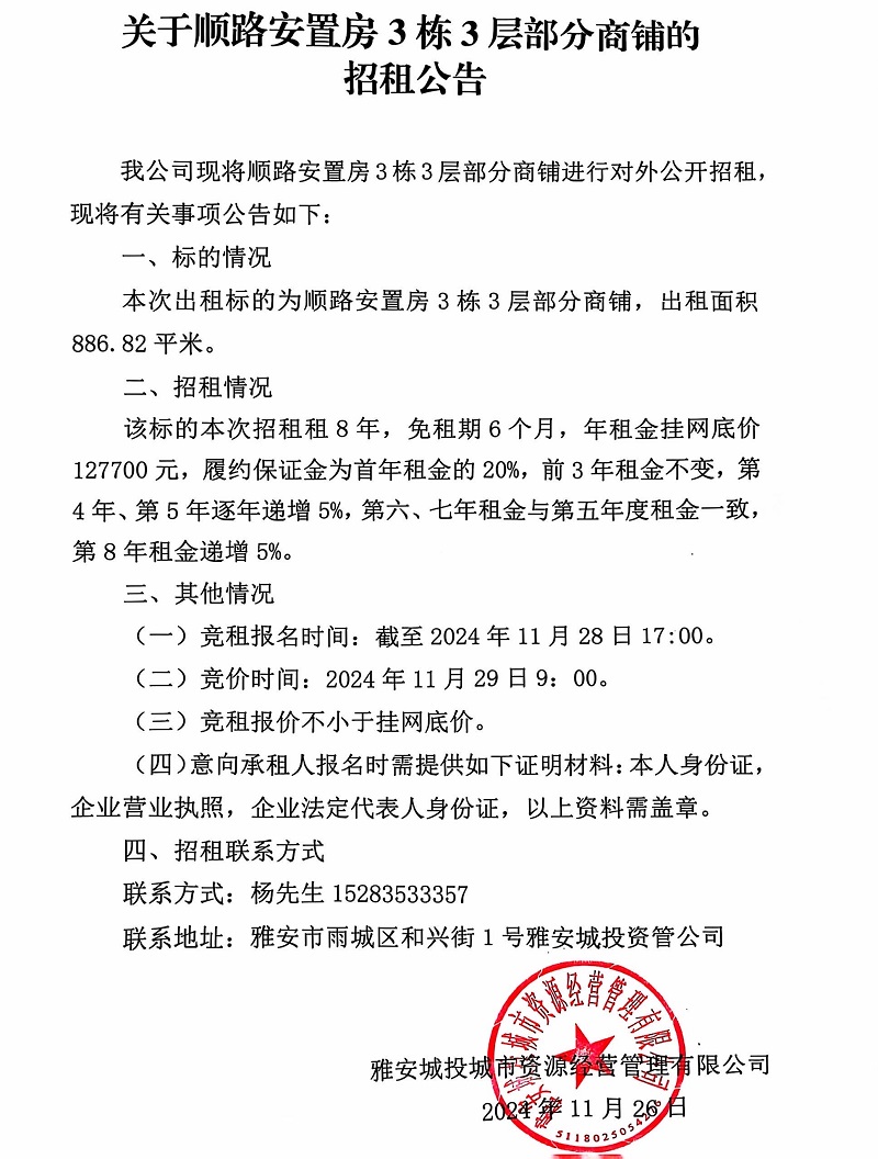 關于順路安置房3棟3層部分商鋪的招租公告