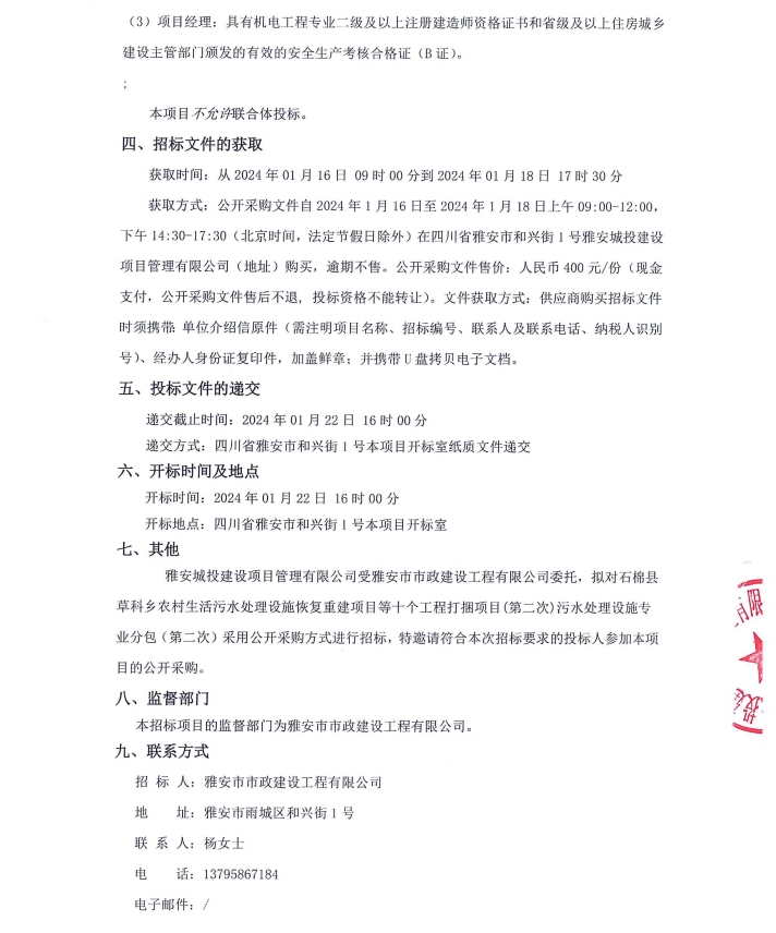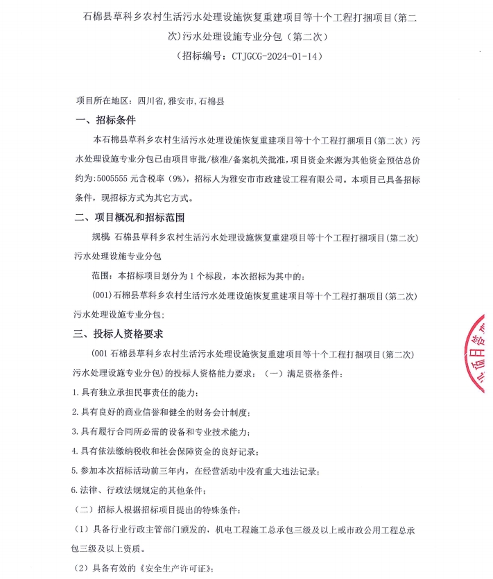 石棉縣草科鄉(xiāng)農(nóng)村生活污水處理設(shè)施恢復(fù)重建項(xiàng)目等十個(gè)工程打捆項(xiàng)目(第二次)污水處理設(shè)施專業(yè)分包競(jìng)價(jià)公告