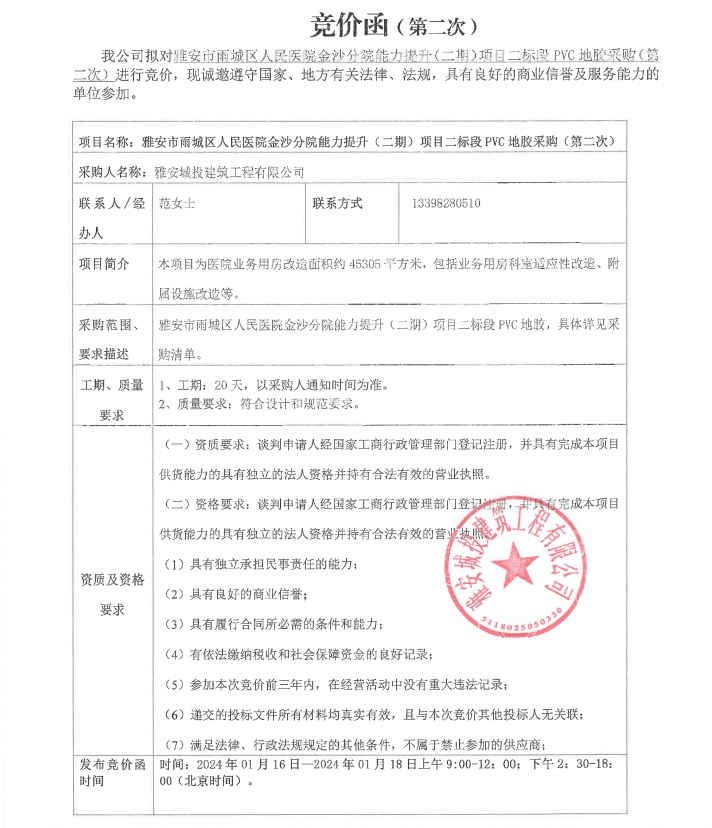 雅安市雨城區(qū)人民醫(yī)院金沙分院能力提升(二期)項(xiàng)目二標(biāo)段PVC地膠采購(gòu)(第二次)競(jìng)價(jià)公告