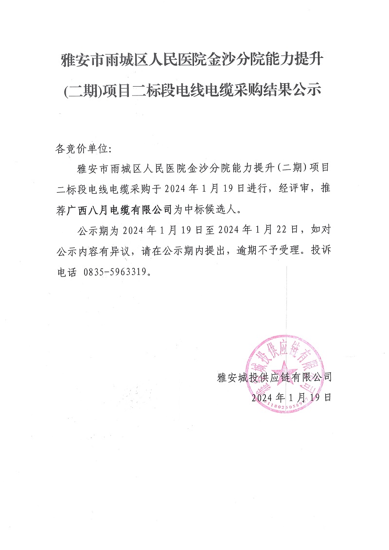 雅安市雨城區(qū)人民醫(yī)院金沙分院能力提升(二期)項目二標(biāo)段電線電纜采購結(jié)果公示