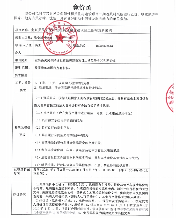 寶興縣靈關(guān)保障性租賃住房建設(shè)項目二期噴漿料采購競價公告