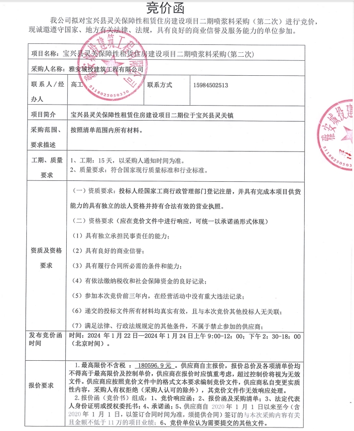 寶興縣靈關(guān)保障性租賃住房建設(shè)項目二期噴漿料采購(第二次)競價公告