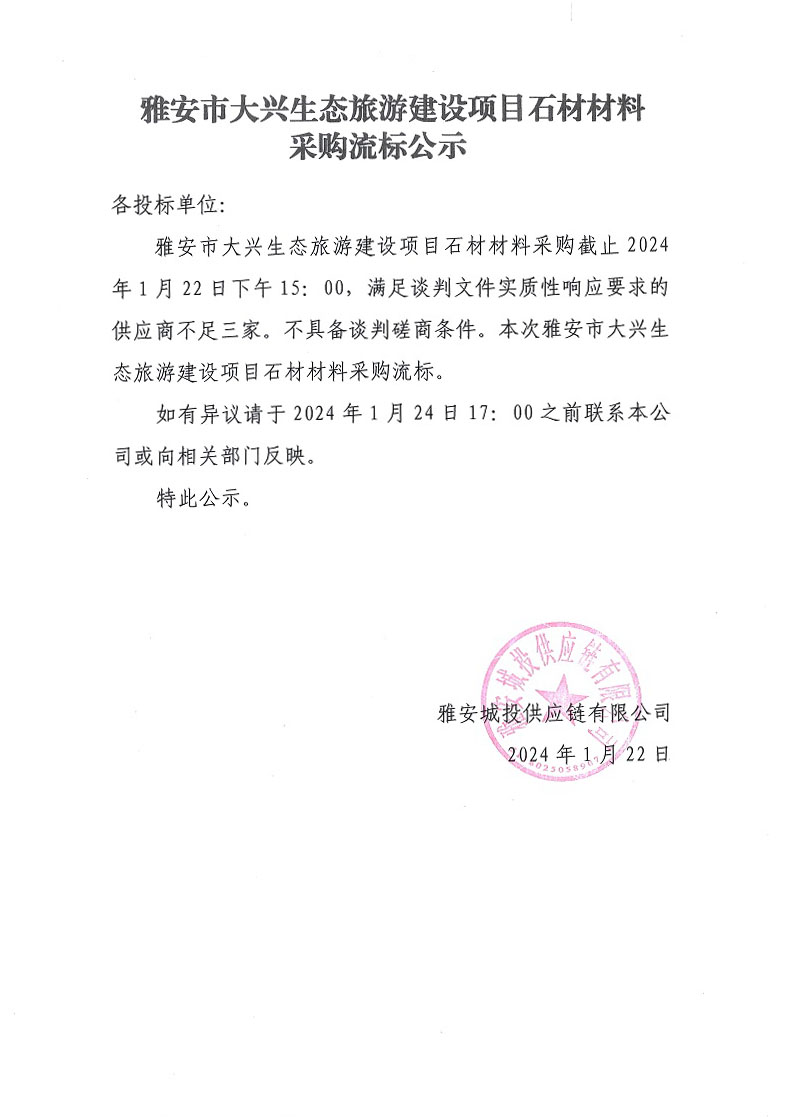 雅安市大興生態(tài)旅游建設(shè)項目石材材料采購流標公示
