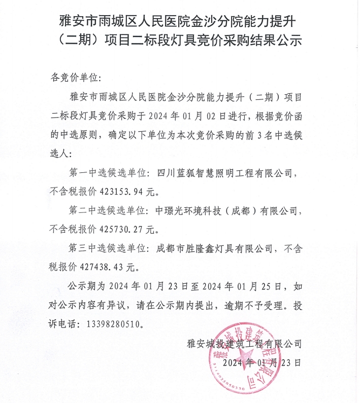 雅安市雨城區(qū)人民醫(yī)院金沙分院能力提升(二期)項(xiàng)目二標(biāo)段燈具競(jìng)價(jià)采購(gòu)結(jié)果公示