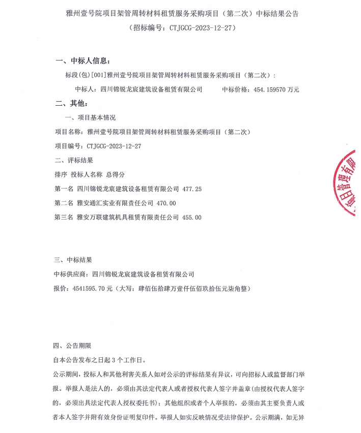 雅州壹號院項目架管周轉(zhuǎn)材料租賃服務(wù)采購項目(第二次)中標結(jié)果公告