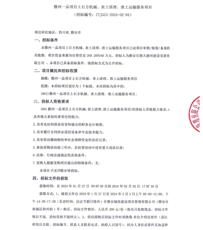 雅州一品項(xiàng)目土石方機(jī)械、表土清理、渣土運(yùn)輸服務(wù)項(xiàng)目公告