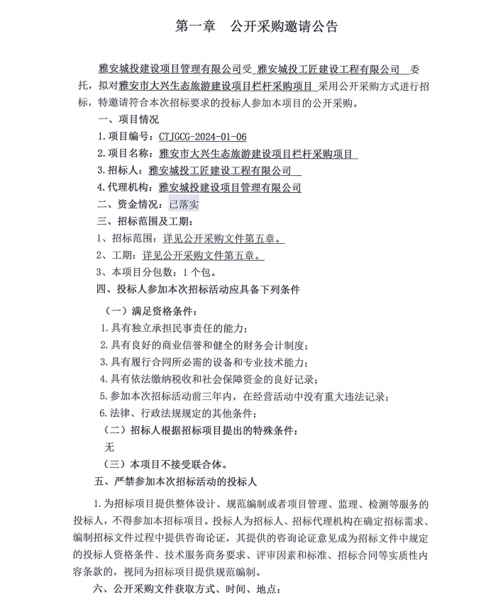 雅安市大興生態(tài)旅游建設(shè)項目欄桿采購項目公開采購邀請公告
