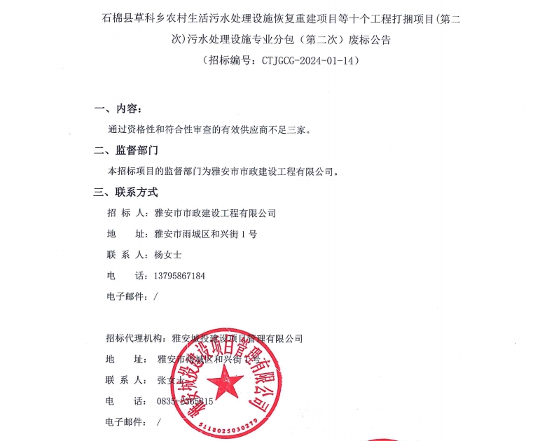 石棉縣草科鄉(xiāng)農(nóng)村生活污水處理設(shè)施恢復重建項目等十個工程打捆項目(第二次)污水處理設(shè)施專業(yè)分包(第二次)廢標公告