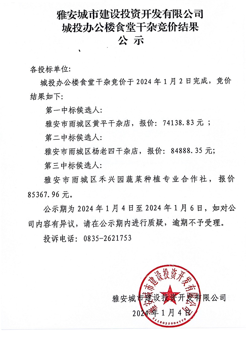 雅安城市建設(shè)投資開發(fā)有限公司城投辦公樓食堂干雜競價結(jié)果公示