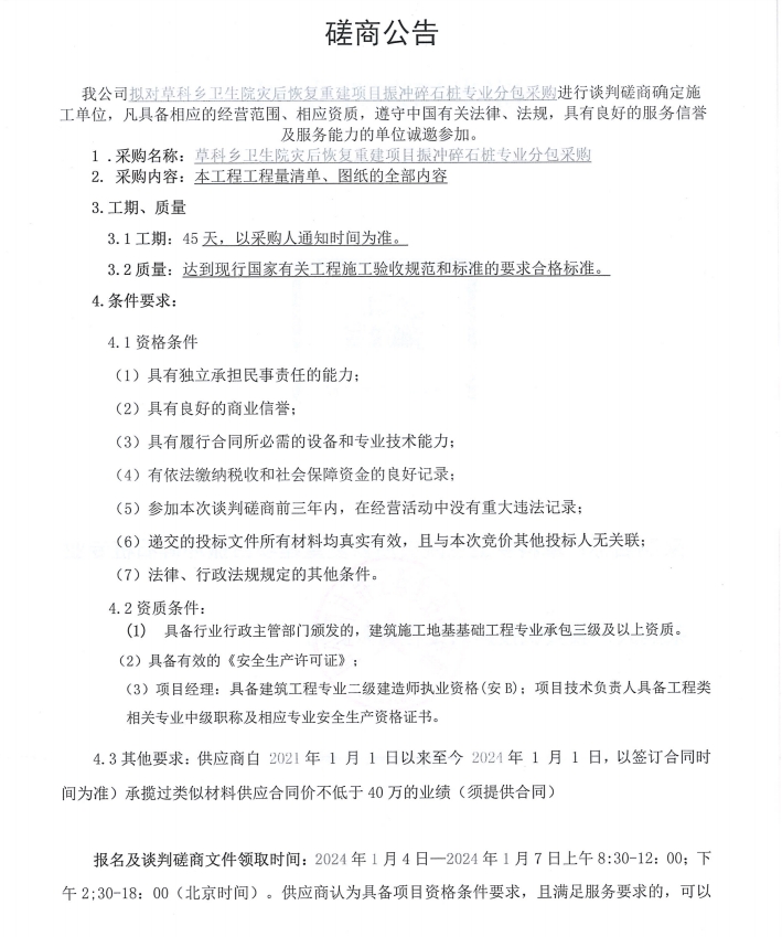 草科鄉(xiāng)衛(wèi)生院災后恢復重建項目振沖碎石樁專業(yè)分包采購談判磋商公告