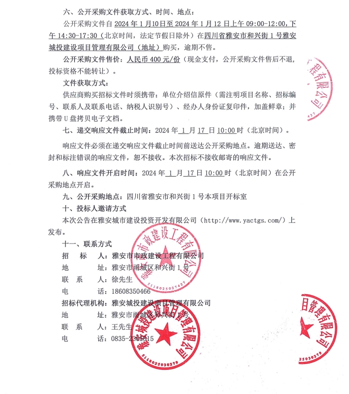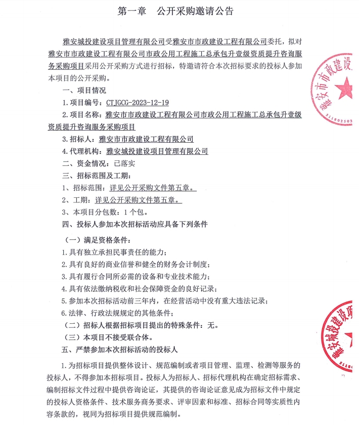雅安市市政建設工程有限公司市政公用工程施工總承包升壹級資質提升咨詢服務采購項目公開采購邀請公告