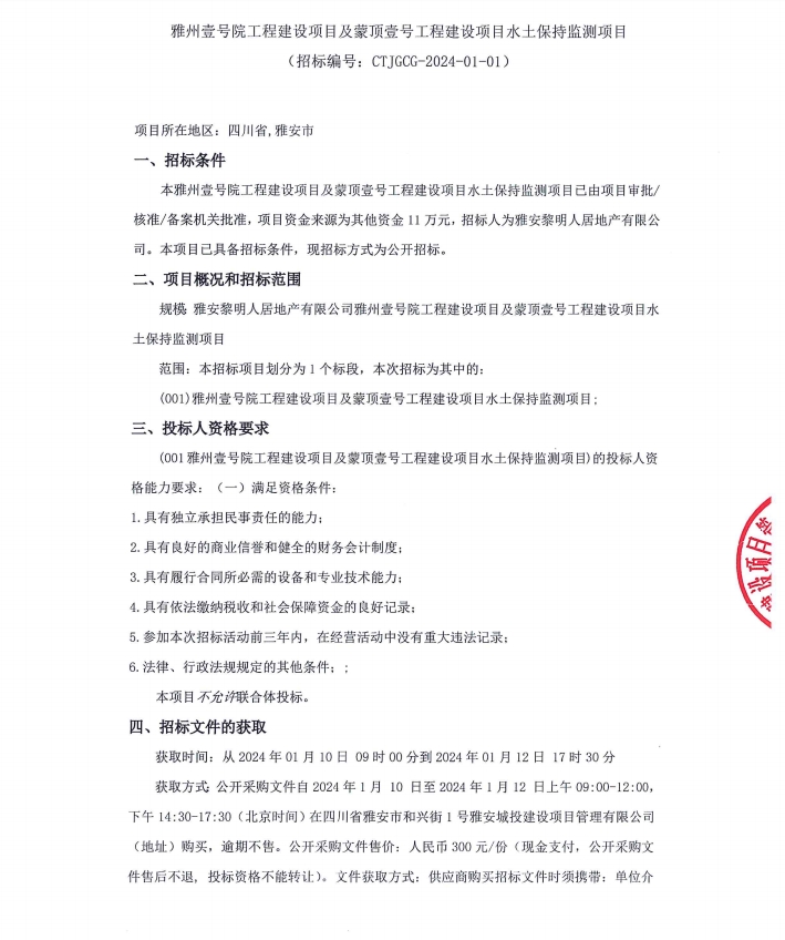 雅州壹號(hào)院工程建設(shè)項(xiàng)目及蒙頂壹號(hào)工程建設(shè)項(xiàng)目水土保持監(jiān)測項(xiàng)目公告