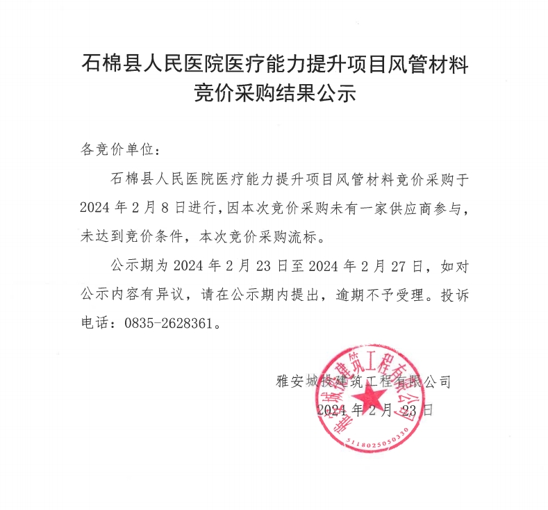 石棉縣人民醫(yī)院醫(yī)療能力提升項(xiàng)目風(fēng)管材料競(jìng)價(jià)采購結(jié)果公示
