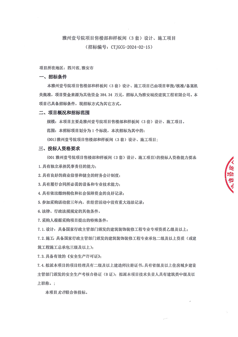 雅州壹號項目售樓部和樣板間(3套)設(shè)計、施工項目招標公告