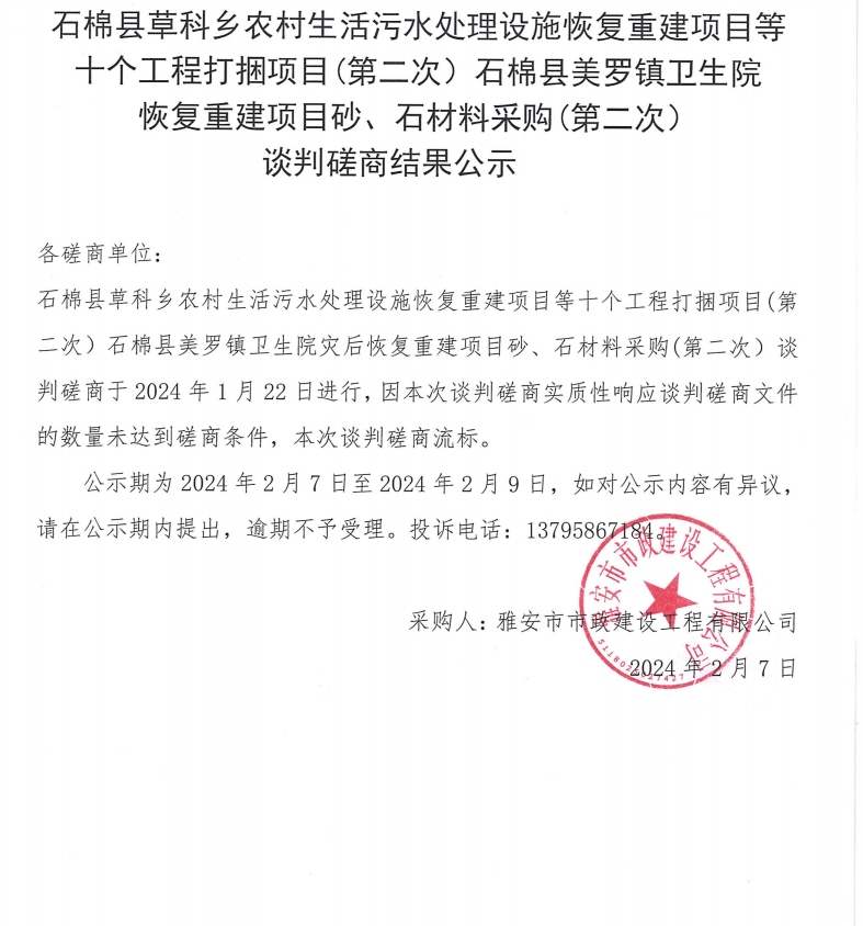 石棉縣草科鄉(xiāng)農(nóng)村生活污水處理設(shè)施恢復(fù)重建項(xiàng)目等十個(gè)工程打捆項(xiàng)目(第二次)石棉縣美羅鎮(zhèn)衛(wèi)生院恢復(fù)重建項(xiàng)目砂、石材料采購(gòu)(第二次)談判磋商結(jié)果公示