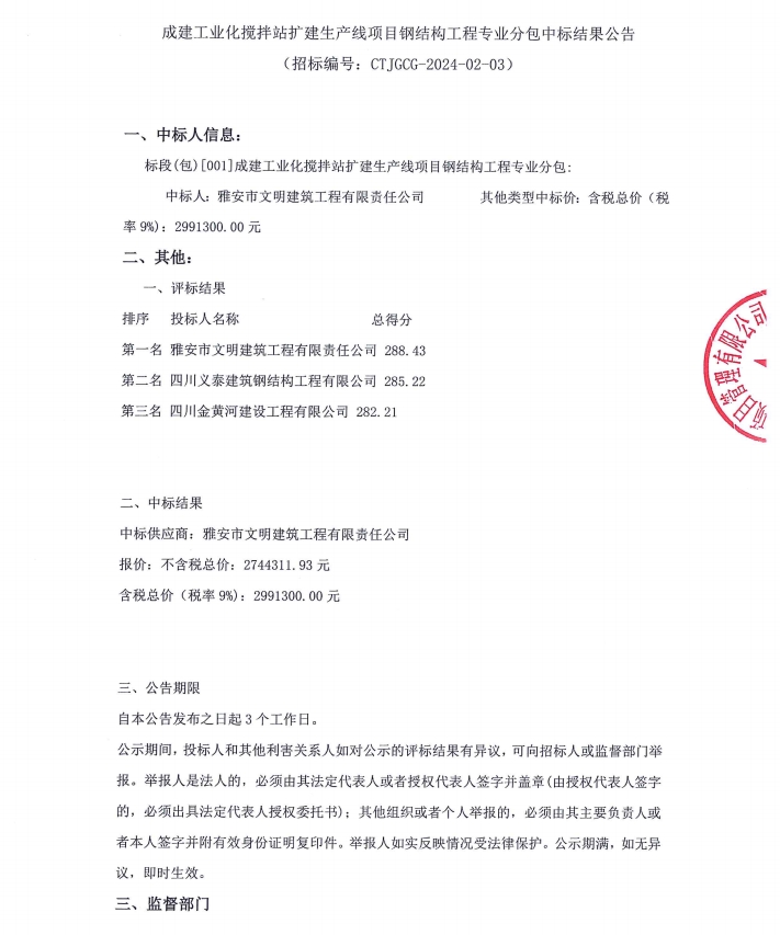 成建工業(yè)化攪拌站擴(kuò)建生產(chǎn)線項(xiàng)目鋼結(jié)構(gòu)工程專業(yè)分包中標(biāo)結(jié)果公告