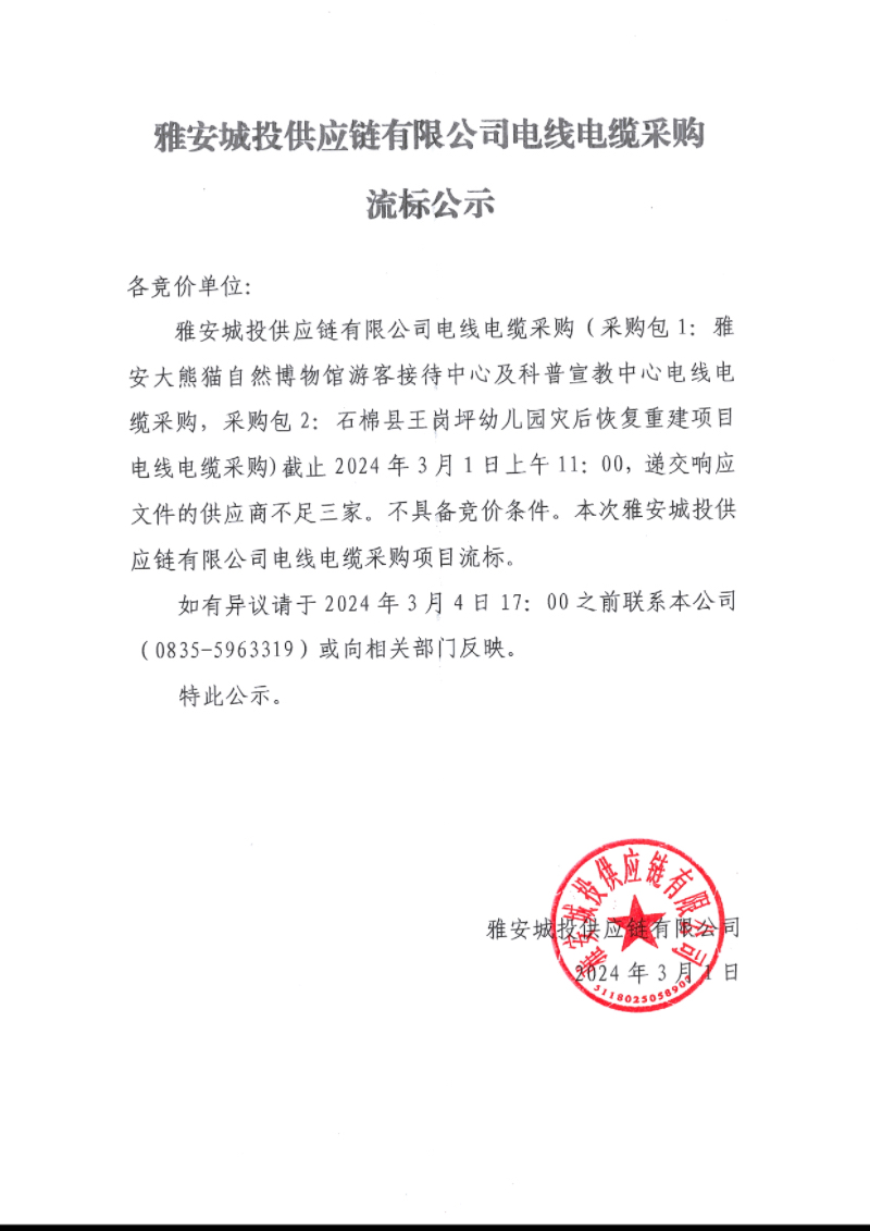 雅安城投供應(yīng)鏈有限公司電線(xiàn)電纜采購(gòu)流標(biāo)公示