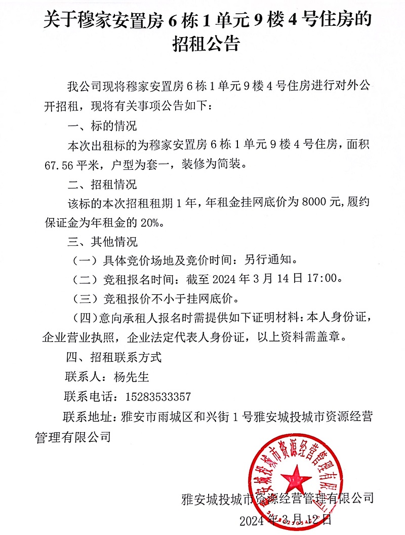 關于穆家安置房6棟1單元9樓4號住房招租的公告