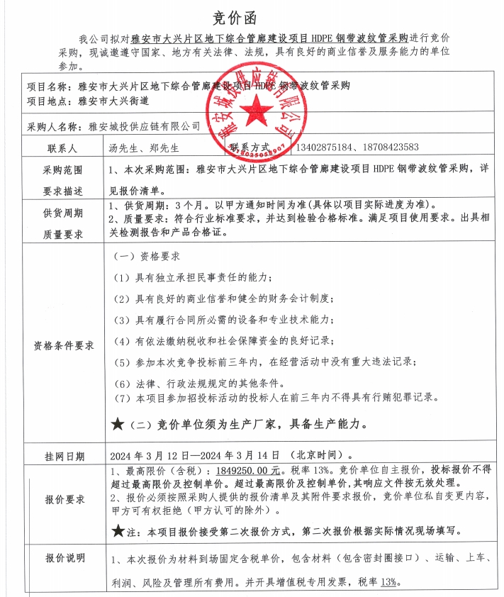 雅安市大興片區(qū)地下綜合管廊建設項目HDPE鋼帶波紋管采購競價公告