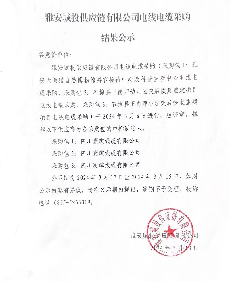雅安城投供應鏈有限公司電線電纜采購結果公示