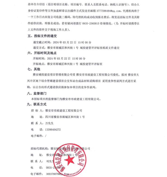 雅安市大興片區(qū)地下綜合管廊建設(shè)項目公交車站臺成品材料采購項目公告