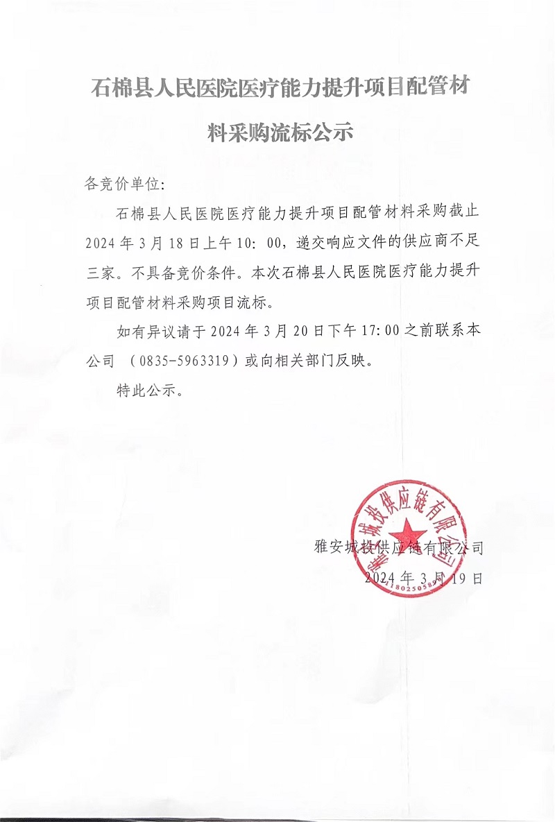 石棉縣人民醫(yī)院醫(yī)療能力提升項(xiàng)目配管材料采購流標(biāo)公示