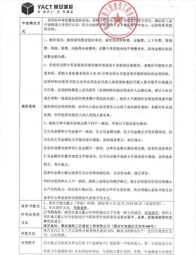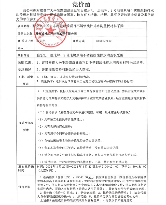 雅安市大興生態(tài)旅游建設(shè)項目不銹鋼線性排水溝蓋板材料采購競價公告